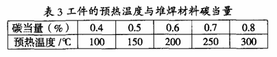 通过对37SIMnZMoV焊接性分析,为防止堆焊层和焊接热影响区产生裂纹,减小工件的变形,需在焊前对工件预热。工件的预热温度与堆焊材料碳当量关系如表3。37SiMn2MoV碳当量为0.84,可知焊前预热温度须在300℃以上,我们采用预热温度400℃,充分满足堆焊温度要求。