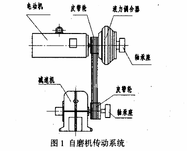 自磨机的传动部分主要有三相异步电动机、皮带轮、窄V带、液力偶合器和减速机组成,如下图所示: