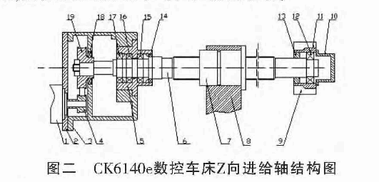本文主要以CK6140e数控车床为例说明数控车床Z进给轴的安装步骤,CK6140e数控车床滚珠丝杠的安装形式主要是C)这种形式。CK6140e数控车床Z向进给轴的结构简图如图二所示,安装过程主要以图二为基础进行说明。