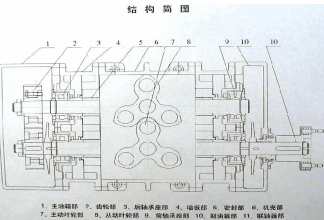 要分析风机的卡涩原因,首先要了解风机的结构。该风机为三叶罗茨风机,结构如下图所示。它的工作原理是通过旋转过程中产生的容积换位来实现介质流动,在此过程中介质会产生大量热量。风机本身既要保证动静部件受热后不发生碰撞;同时为了提高效率必须具备尽可能小的泄漏间隙,减小泄漏损失。因此,无论从设计、安装和检修角度,以及运行的经济性而言,都必须对风机各部间隙进行精确控制。
