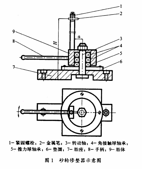 用转动轴将胎座、垫圈、胎体固定在一起,为胎体与转动轴之间转动灵活,装有一套精度为P4的角接触球轴承,为操作方便在胎体的一侧焊接有手柄,在胎体上端面焊接一长方体立柱,立柱上端加工一通孔以安装金刚石修整笔。