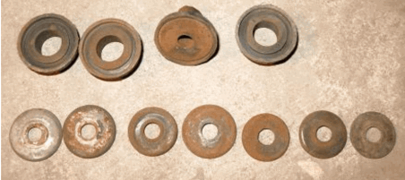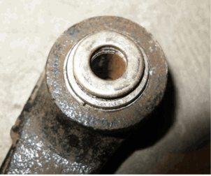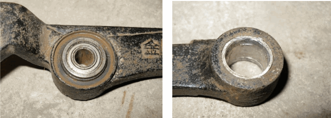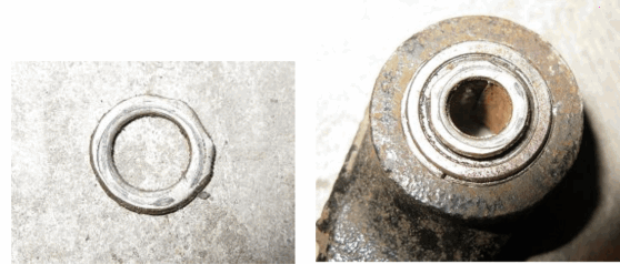 拆下车头摇臂,发现摇臂与车头前叉和前轮避震间的配合结构为薄铁皮圆垫片以及塑料轴瓦。使用3年后,塑料轴瓦被磨变形,薄铁皮圆垫片内孔也被磨偏心。