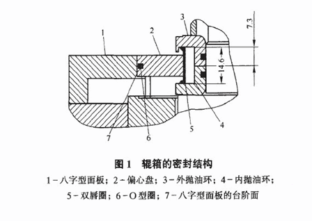 辊箱的密封由动密封和静密封两部分组成,动密封见图1中的双唇圈,轧辊的高速旋转及高压冷却水易将氧化铁皮等杂质带入抛油环与双唇圈之间,造成双唇圈磨损。另外,内、外抛油环与双唇圈之间的压紧量不当也会导致辊箱进水。静密封的两零部件之间是相对静止的,如果装配尺寸不当,也会进水。实际生产中,进水往往发生在偏心盘与八字型面板之间。