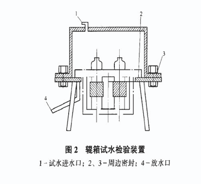 装配好的辊箱必须经过试水检验,确认合格后方可作为合格备件上线使用,检验设备见图2。从进水口注入加有乳化液的水(加入乳化液是为避免辊箱锈蚀),然后在下面检查辊箱是否漏水,若有水渗出,则可从下面直接观察到是双唇圈进水还是偏心盘或其他部位进水,再根据上述方法进行分析解决,直至漏水检验合格为止。