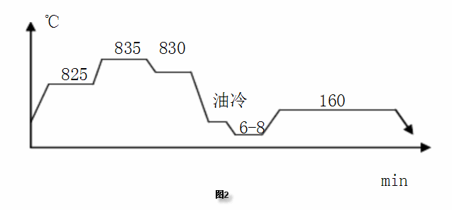 在对30216外圈进行淬回火时,套圈摆放2层,相互之间留3-5mm间隙,油温为110℃。其工艺曲线如图2所示。