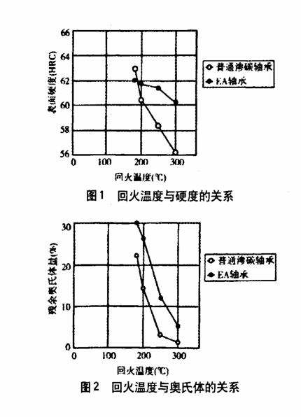 矿山机械设备,特别是辊径设备所用轴承一般采用渗碳钢进行特殊热处理,使材料的滚动表面层得到了强化,对轴承使用寿命有很大提高,使表面损伤降低到Z低点,上把这种轴承称为特殊热处理轴承(EA轴承)。此类轴承与普通渗碳钢轴承相比,是以高清洁度润滑油为基础的,即使有异物浸入轴承内部,轴承的寿命、疲劳强度、磨损强度、耐剥落等性能均好于其它类轴承。经过特殊热处理的轴承,其工作表面分散有残余奥氏体和碳化物,从而达到材料组织的热稳定性。在回火状态不易改变材质性能,不易产生裂纹并且裂纹不容易扩展,这对避免表面点状损伤是有效的。通过试验(图1、图2)表明普通渗碳钢与特殊热处理轴承钢回火后的硬度变化,残余奥氏体变化以及在高温下的关系。结果表明,特殊热处理钢轴承与普通渗碳钢轴承相比,特殊热处理钢轴承具有较高的回火稳定性和稳定的残余奥氏体组织。根据试验数据表明,在恶劣条件所使用的特殊热处理轴承,它的寿命比普通渗碳轴承的寿命要高大约3倍左右。