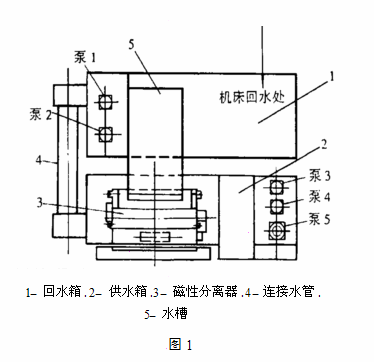 原来的冷却系统如图1所示,冷却水循环过程是:机床回水→回水箱→连接水管→水泵(3、4、5)→机床。其中,水泵(1、2)把回水箱中的沉淀物泵入水槽,再经磁性分离器后入供水箱。