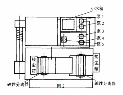 改进后的冷却系统如图2所示,冷却水循环过程为:机床回水→泵(1、2)→增设的磁性分离器→水槽→原来的磁性分离器→供水箱→连接水管→回水箱→泵(3、4、5)→机床。这样,原来水槽、水泵的位置都作了改动,供水箱和回水箱也作了相互置换。经过改进,回水箱中的水变得干净了。