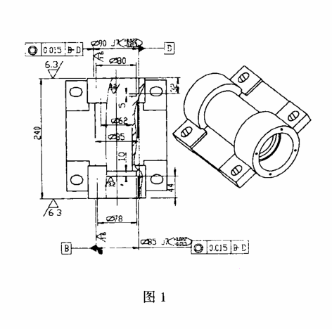 图1所示的轴承座零件是我公司重点产品的关键件,其两端轴承孔的同轴度要求为0.015mm以内,并且还有一系列的公差要求。加工难度大。以往在镗床T68上加工按通常的方法有几种,其中一种方法是加工完右端内孔后,采用镗刀往回拉的形式加工另一端内孔;另一种方法是用调转工作台的方法加工两端同心孔。但都因镗杆(主轴)伸出太长,刚性较差,均难保证其精度。以上两种方法 加工显然达不到要求,而且偏差测量困难,也不易保证,费时、费力、加工效率极低,加工质量也很难达到。为此,我们设计了一种夹具,满足了生产需要,效果也很好,现介绍如下: