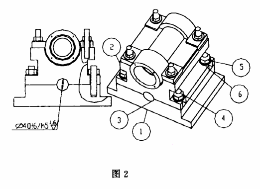 其夹具结构如图2,它是由下座1、上座2、定位轴3、螺栓4、螺母5、垫圈6等件组成,件1固定在工作台上,通过件3与件2定位连接。件1、件2接合处Ø40孔与件3Ø40外圆配合加工,其配合间隙在0-0.01mm范围内,粗糙度为1.6。