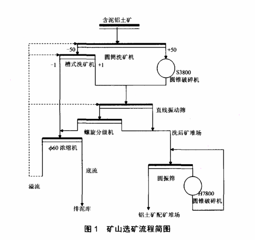 随着我国经济的迅速发展,矿产企业之间的竞争更为激烈,科学技术已成为企业之间的核心竞争力,而技术创新则是保证企业在竞争中立于不败之地的一把利剑。采矿业普遍存在着生产和技术落后、设备老化、资源条件差等问题,导致了产品质量不高,成本却较高,从而降低了企业的竞争力[1]。矿产分级过程是选矿生产中极为重要的环节,稳定的生产工艺可以降低消耗,优化选矿工序,达到较佳的经济指标。其中,分级机作为矿产分级的重要设备起到了很大作用。华银铝矿山铝土矿属岩溶堆积型矿床,特点是原矿含泥量大部分达到40%以上。矿山选矿工艺流程包括洗矿、破碎、排泥3个主要环节(图1),因为矿石粒度分布范围很宽,Z小颗粒小于 1mm,故原矿经过多道工序后由FG-20螺旋分级机对直线筛下石进行回收。它具有一定的沉降区域,适用于粗粒分级,可以获得大于100网目的溢流粒度。