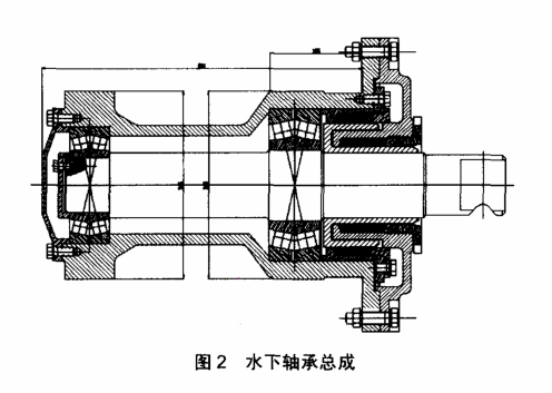 (3)水下轴承总成(下部支座):螺旋下端在水槽内水线以下, 由下部支座支承,螺旋的轴向力由上部支承中的滚动轴承承担, 部支座不承受轴向力,只承受径向力,该支座安装在水槽下端的外面。下部支座中的下轴螺旋端由法兰联接,为保护短轴,其上压入一个不锈钢耐磨套,工作时在柔韧的橡胶水封中旋转,以保证下部支座长久使用后仍能密封良好。