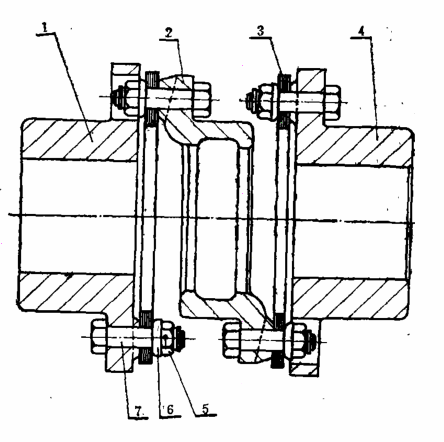 弹性组片联轴器结构如附图所示。它由主动法兰盘1、联轴盘2、弹性片3、从动法兰盘4、螺母5、球垫6和螺栓7等组成。主、从法兰盘和联轴盘均采用ZG35号钢,经调质处理加工而成。应确保盘上螺孔的精度和形位要求,从而使受载均衡。孔的凸台应做成球面,以防棱边损坏弹性片。