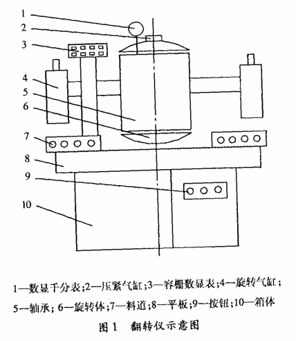 以往在检测352226X2-2RZ铁路货车轴承轴向游隙时,通常采用翻转仪(图1)。该仪器由箱体、旋转体、测量组件、气动元件和电气控制显示部件等组成。旋转体由旋转气缸带动做180°回旋运动,旋转体上配有压紧气缸及测量组件,整个操作过程靠人工完成。首先,将被测轴承由上料道直接送入旋转体的定位面上,将轴承压紧并靠在轴台上完成初定位,压板通过压紧气缸固定内圈,不需外加载荷,人工操作转动外圈,按旋转按钮旋至180°,再用手转动轴承外圈,转动多圈后,数显表上显示出轴向游隙值。这种操作消耗人力且生产效率低下,测量误差大,不能准确地测量出轴向游隙真实值,无法满足现有生产需要。