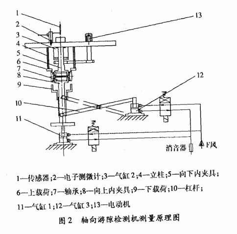 检测原理如图2所示。测量轴向游隙时,被测轴承自动进入轴向芯轴定位面上,由上引导轴及上、下夹具将轴承内圈夹紧,轴承升降高度由气缸1控制。被测轴承上方安装有电动机、齿轮和皮带,上载荷自重和下载荷加载装置将被测轴承外圈固定。在立柱上固定有可上下移动的载荷块,在被测轴承外圈上端面施加一个由上而下的轴向载荷;下载荷由气缸3控制,通过两个可自由活动杠杆在被测轴承外圈下端面施加一个由下而上的外加轴向载荷,消除其内组件中的滚子球基面与内圈大挡边之间的间隙。