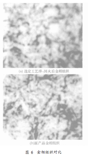 采用所选定的热处理工艺,淬、回火后的组织为细针状马氏体,比原产品的粗针状马氏体要好得多;淬火深度及位置也基本满足条件要求。图6为所选定工艺淬、回火后金相组织与原产品金相组织的对比。