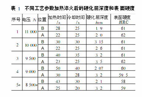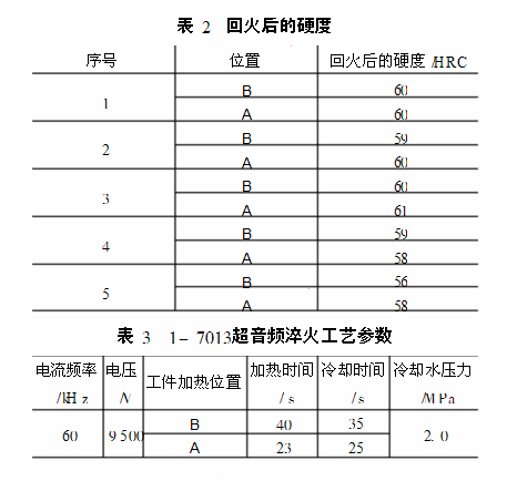 因GP200L-C3型超音频加热淬火设备的电流频率为50~200kHz,加热方法为同时加热法,A、B两外沟道面分别加热,加热和冷却时间由继电器控制。工艺试验结果如表1所示。由表中可知序号3工艺能满足产品技术条件要求。