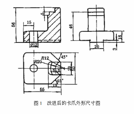 针对存在的问题,对原卡爪的结构进行了改进。改进后的卡爪有两个台阶面(见图1),一个台阶面的径向宽度改为8mm,卡爪的周向宽度改为20mm,圆弧面半径由16mm改为12mm,是根据内径25mm确定的,可用来装卡轻、中、重系列深沟球轴承。另一个台阶面的径向宽度为3mm,是根据内径45mm的超轻及特轻系列深沟球轴承内圈端面径向宽度尺寸而确定的,可用来装卡超轻及特轻系列深沟球轴承。