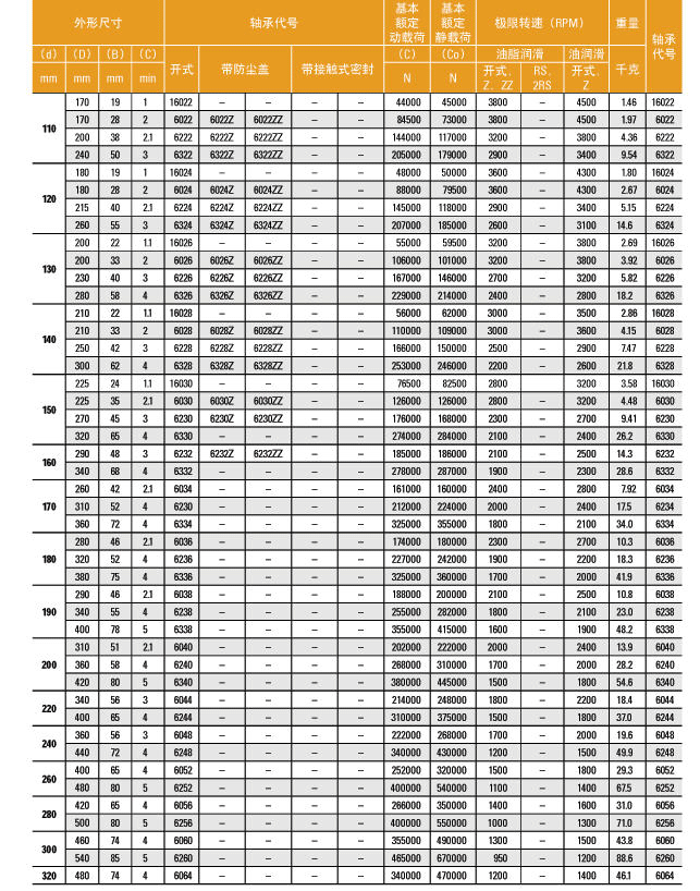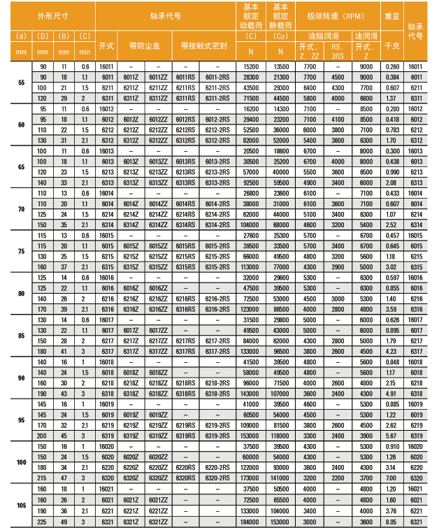 单列深沟球轴承的型号列表。