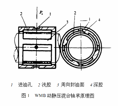 WMB型液体动静压混合轴承是一种多油膜液体动静压混合轴承,在MG1432型磨床就是应用了这种轴承,其结构原理图见图1所示。它利用压强为Ps的液体通过进油孔进行次节流———孔式环面节流;进入深腔后,又流经浅腔构成了第二次节流———浅腔节流;然后经封油面流出,两次节流使得油压趋于稳定。主轴转动时,由浅腔和周向封油面构成了多个阶梯动静压轴承。进油口处的深腔,既减弱了主轴位移对孔式环面节流性能的不利影响,又保证了动压轴承的充分供油,提高了轴承工作的可靠性。轴承采用多腔结构,充分利用了结构空间以提高其承载面积。此种系统一般适用于线速度不低于4m/s、定向旋转的精密主轴承支撑系统中。