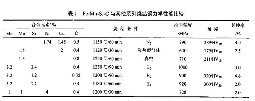 将锰和硅作为合金元素同时添加的低合金烧结钢,表现出良好的强化效果和烧结尺寸稳定性,价格便宜,具有很强的竞争优势。据相关报道,1250℃保温60min烧结的Fe-3.2%Mn-1.4%Si-0.4%C合金,拉伸强度达800~1000MPa。烧结铁和烧结钢主要用于制造机械零件,在选择合金元素时,必须注意到其对尺寸稳定性的影响。在一般情况下,加入硅会引起压坯在烧结时收缩,而加入锰则会引起压坯膨胀。同时加入锰和硅,能够较好控制烧结体的外观形状和尺寸。在测定的5种成分试样的尺寸变化ΔL/L0中,发现Fe-2.0%Si-2.0%Mn和Fe-2.0%Si-4.0%Mn基本与纯铁相同,尺寸变化为1.2%~1.4%;而Fe-4.0%Mn较高,约为1.7%;Fe-2.0%Si较低,约为0.7%[10]。其中列举了几种含镍、钼、铜、锰、硅烧结钢的力学性能,如表1。可以看出,同时添加锰和硅合金元素的烧结钢具有很高的性能。