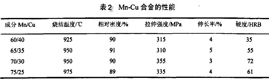 据1976年的相关报道,通过粉末冶金方法已开发成功Mn-Cu阻尼合金。烧结在露点较低的氢气中进行,Z终烧结温度取决于锰含量,含55%Mn的合金约900℃,含75%Mn的合金升高到1075℃。当锰粉粒度由-100目减小到-325目时,烧结密度和拉伸强度略有增加。60Mn-40Cu合金在真空中烧结,如果烧结温度不低于氢中烧结,则锰将显著挥发。压坯在加热过程中先有百分之几的膨胀,当温度接近Z终烧结温度时才发生收缩。表2列出了60%~75%Mn合金(含1%粘结剂)的拉伸强度和硬度数据。试样在氢气中加热,于760℃保温0.5h,860℃保温1h,Z终烧结温度保温1h,可获得Z大拉伸强度。孔隙和其他组织特性降低力学性能,但增加相对阻尼性能。材料烧结后便可获得良好的阻尼性能,从简化工艺和降低成本的角度出发,这一点是可取的。
