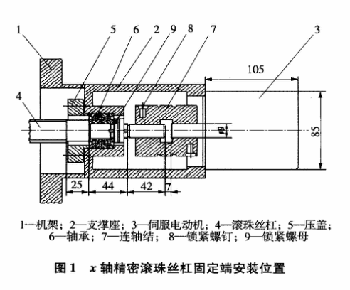 图1为一台数控铣床轴精密滚珠丝杠固定端安装位置图。丝杠4靠压盖5和锁紧螺母9安装到支撑座2上,伺服电动机3也安装在支撑座2上,丝杠端和伺服电动机端靠连轴结7连成一体,传递扭矩。在安装过程中支撑座2的制造精度至关重要,而其中安装丝杠端的轴承孔和安装电动机端的定位孔两者之间的同心度更是这关键中的关键。