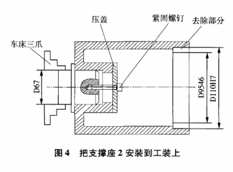 2) 在后面的加工过程中,工装不要卸掉,以保证一装夹到位。工装车好后如图4所示把支撑座2安装到工装上,安装过程中注意用紧固螺钉和压盖把支撑座2牢牢的紧固到工装上。把孔D95H6车到D110H7。