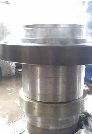 3、分离后将轴和轴承竖直放在地方上用大锤对角砸损坏的两盘轴承,将其与轴脱离,取出两盘轴承间的挡圈(内挡圈和外挡圈)。