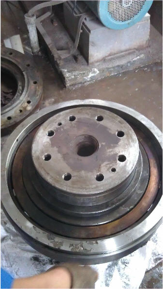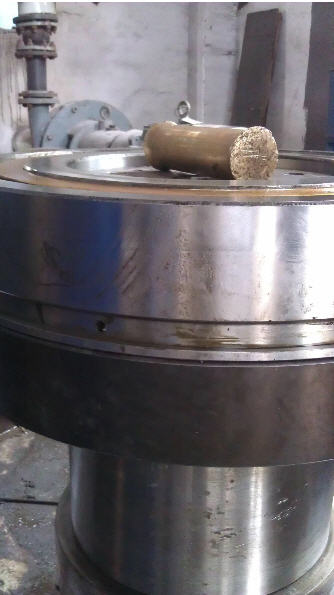 5、用木方和大锤将圆柱滚子轴承从轴承座中分离出来,至此轴承拆卸完毕。用汽油将轴、轴承座和轴承清理干净。