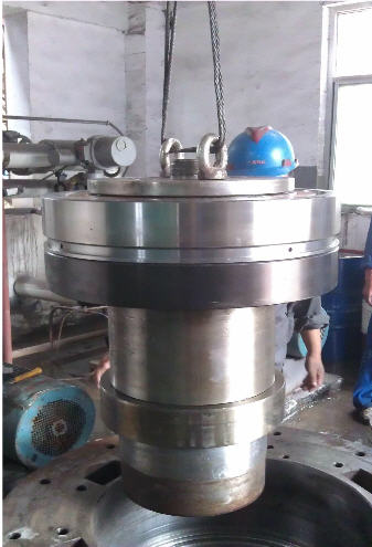 8、等轴承都冷却后,将离心盘装上用螺栓拧紧。用天车将轴承座吊起竖直放在地面,将轴用天车垂直吊起放入轴承座中(具体见下图)