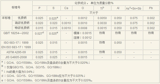 本标准的化学成分指标与GB/T 18254—2002、ISO 683—17:1999、EN ISO 683-17、ASTMA295—09对比结果见表1,由表1可知,本标准的指标均严于上述标准。