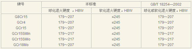 在“工作组草案”的征求意见稿中,洛阳轴承研究所提出软化退火的目的是为了锯切料便利,没必要按等温球化退火的硬度进行考核,建议软化退火钢材的硬度可以放宽到≤245HBW,本标准采纳了该条建议,具体内容见表2。