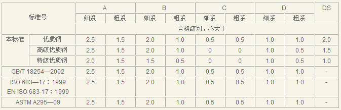 本标准中优质钢的非金属夹杂物指标在原国标的基础上增加了DS ,与国外某公司标准的指标相同。