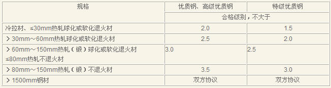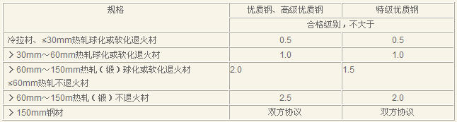 本标准对优质钢和高级优质钢的规定与GB/T 18254—2002相同,对优质钢规定在原国标的基础上加严了。在厦门会议上,代表建议将标准中“冷拉(轧)材”改成“冷拉材”;>60mm热轧(锻)球化或软化退火材改成“>60mm~150mm……”;增加“>150mm”规格,合格级别为“钢材双方协商”,具体内容见表5。