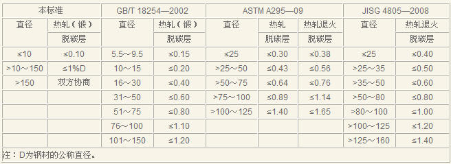 在上海工作会议上,洛轴所代表认为原国标的热轧(锻)圆钢的脱碳层指标按钢材的尺寸组距考核,缺乏科学性和合理性,提出参照国外标准,并规定钢材脱碳层深度按≤1%D(D为钢材的公称直径)考核的建议,本标准修订时基本采纳了洛轴所代表的建议,本标准参照了ASTMA295—09、JISG4805—2008标准,规定规格不大于10mm钢材的脱碳层为不大于0.10mm,规格大于10mm钢材的脱碳层为不大于1%D(D为钢材的公称直径),具体内容见表6。