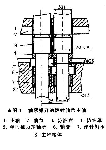 主轴上的轴承因承受较大轴向力,所以用滚针轴承和单向推力球轴承来组合。对于采用轴承错开安装的主轴结构(如图4所示,中心距小于28mm,必须用这种结构),只能分别选用滚针轴承(84000型)和单向推力球轴承(8000型);对于不受结构限制的主轴,可选用组合轴承(GB/T 16643-1996,NKXR型为无内圈,NKXR…Z型为有内圈),这种轴承集滚针轴承(84000型)和单向推力球轴承(8000型)于一体,一般情况下,应优先选择这种轴承。