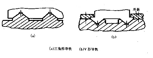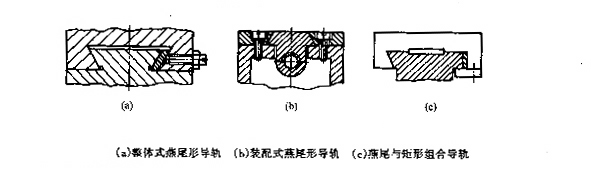 图5(a)所示为整体燕尾形导轨;图5(b)所示为装配式燕尾形导轨,其特点是制造、调试方便;图5(c)所示为燕尾与矩形组合,它兼有调整方便和能承受较大力矩的优点,多用于横梁、立柱和摇臂等导轨.。