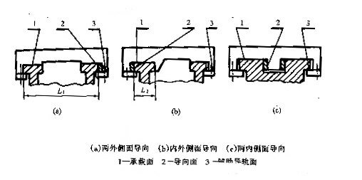 采用矩形和矩形组合时,应合理选择导向面。如图2(a)所示,以两侧面作导向面时,间距L1大,热变形大,要求间隙大,因而导向精度低,但承载能力大;若以内外侧面作导向面,如图2(b)所示,其间距L2较小,加工测量方便,容易获得较高的平行度,热变形小,可选择较小的间隙,因而导向精度高;两内侧面作导向面,如图2(c)所示,导向面2对称分布在导轨中部,当传动件位于对称中心线上时,避免了由于牵引力与导向中心线不重合而引起的偏转,不致在改变运动方向时引起位置误差,故导向精度高。