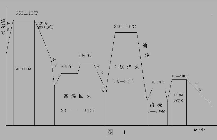 从附图1可以看出20Cr2NI4A等渗碳钢的深层渗碳处理的总时间需要130-190小时,工艺复杂,生产周期长,从能源到补助材料消耗都很大。目前国内轴承生产上对渗碳钢基本上都采用这种类似工艺。渗碳周期长。