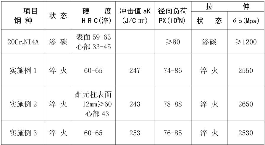 本发明的优点和效果是对于轴承套圈有效壁厚大于45mm以上尺寸段,由于采用本发明钢种和热处理工艺,可直接用高频表面淬火处理工艺,不仅方法简单而且达到轴承的使用技术要求。它与传统的工艺方案(等温和渗碳工艺)相比,提高轴承的硬度,提高强度及耐冲击性能。表1为本发明三个实施例与渗碳钢的机械性能对照表。