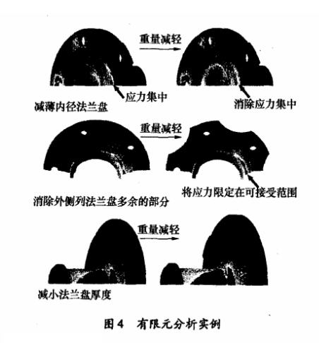 第二代和第三代轮毂轴承设计的过程中进行了有限元分析(FEM),在保证法兰盘足够刚性的同时进一步减小其重量。图4是对HUBK进行有限元分析的实例,在保证刚度的前提下减少其厚度来实现法兰盘的Z优设计。
