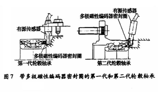 多极磁性编码器密封圈(多极磁性橡胶硫化在金属环上)比齿轮型的传感器转子更常用。由于与密封圈一体化设计,采用多极磁性编码器密封圈比传统传感器转子轻很多。零部件减少降低了传感器转子的体积和重量。多极磁性编码器促进了有源传感元件的应用,例如磁阻元件(MRE)旋转传感器和霍耳效应传感器。磁阻元件旋转传感器对转速高低没有限制,因此可以测量几乎静止的车轮转速。与传统磁感应传感器不同,磁阻元件与多极磁性编码器密封圈一体化,使得轮毂轴承的结构更加紧凑。图7给出了带多极磁性编码器密封圈的代和第二代轮毂轴承的例子。