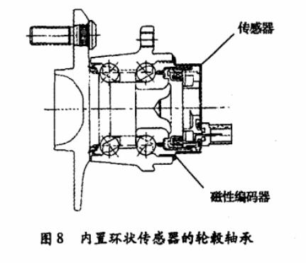 非驱动轮用内置环状传感器轮毂轴承(图8)结构紧凑、重量轻,有效利用了轮毂和轴承的内部空间。这种结构的传感转子输出信号强,低速行驶时无源传感元件也可测量车轮速度。
