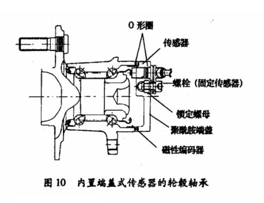 内置端盖式传感器的轮毂轴承(图10)有两种结构:分离型和一体型。分离型的优点是批量生产的标准化传感器更换方便。一体型传感器端盖结构紧凑、轻巧,进一步缩小了轮毂轴承的体积。