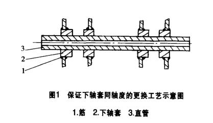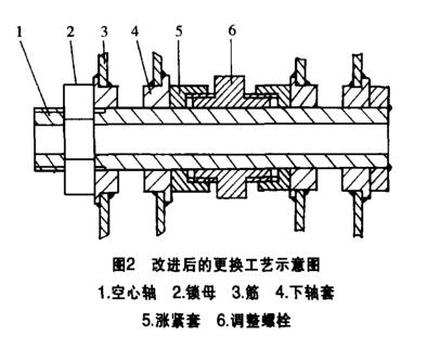 更换时,具体做法是,将4个加工好的下轴套按图2所示镶入对应的筋孔中;将2个涨紧套与调整螺栓组合起来, 且使之能进入图示位置:将空心轴从外依次穿过2个下轴套、涨紧套组合件和另外2个下轴套,并用锁母将空心轴锁紧;拧动调整螺栓,使2个涨紧套压紧2个下轴套,在下轴套与筋的适当部位进行焊接;冷却后将空心轴和涨紧套组合件拆除,即更换完毕。