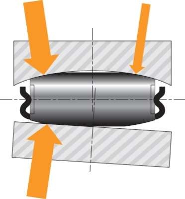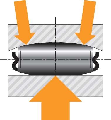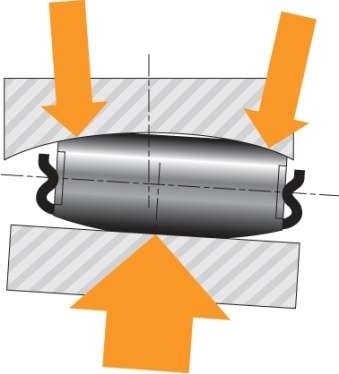 其外圈滚道是球面形状设计,滚子是带有特殊修型的弧线形设计,而内圈滚道是平面形设计(圆柱体)。上述独特外形设计结合在一起,可形成“三点接触”。具体来说,就是内圈与滚子在单一位置互相接触,而滚子与外圈在两个位置接触。外圈接触位置以内圈接触位置为中心对称分布,从而保证滚子受力时处于稳定状态。