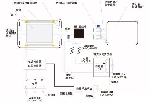 用混合陶瓷轴承来代替电机轴承,以使轴承与定子绝缘。离心泵中的一个6203轴承也被混合陶瓷轴承所代替。离心泵的前轴承是我们要考虑的试验轴承。采用外部单相交流电源向电机主轴提供交流电流。由于电动机侧绝缘,所以电流流过离心泵上的试验轴承,并从泵外壳返回。另设置两个功率电阻器来限制轴电流。