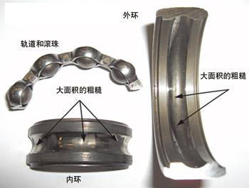 图4的上图显示了试验内容之一,振动程度的变化。在大约第11个小时时向电机主轴提供交流电流,开始损坏泵轴承。在大约第16个小时后,振动程度呈指数级增长,超过了检测阈值,证明泵轴承性能已经真正退化。图4的下图显示了同一个实验的FDIC。在大约第14个小时,FDIC增大到超过检测阈值的程度,此时正是轴承性能开始退化的第3个小时,尚未出现任何泵轴承的重大故障。图5是受损轴承的照片,从中可以看到轴承外环和内环的表面粗糙程度。