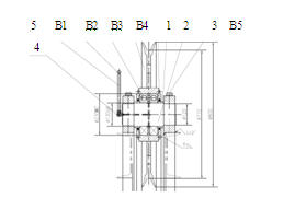 1)轴套;2)滑轮轴;3)轴承座;4)加油接头;5)油管;B1)油嘴;B2)422XX系列轴承;B3)滑轮;B4)油封;B5)螺栓